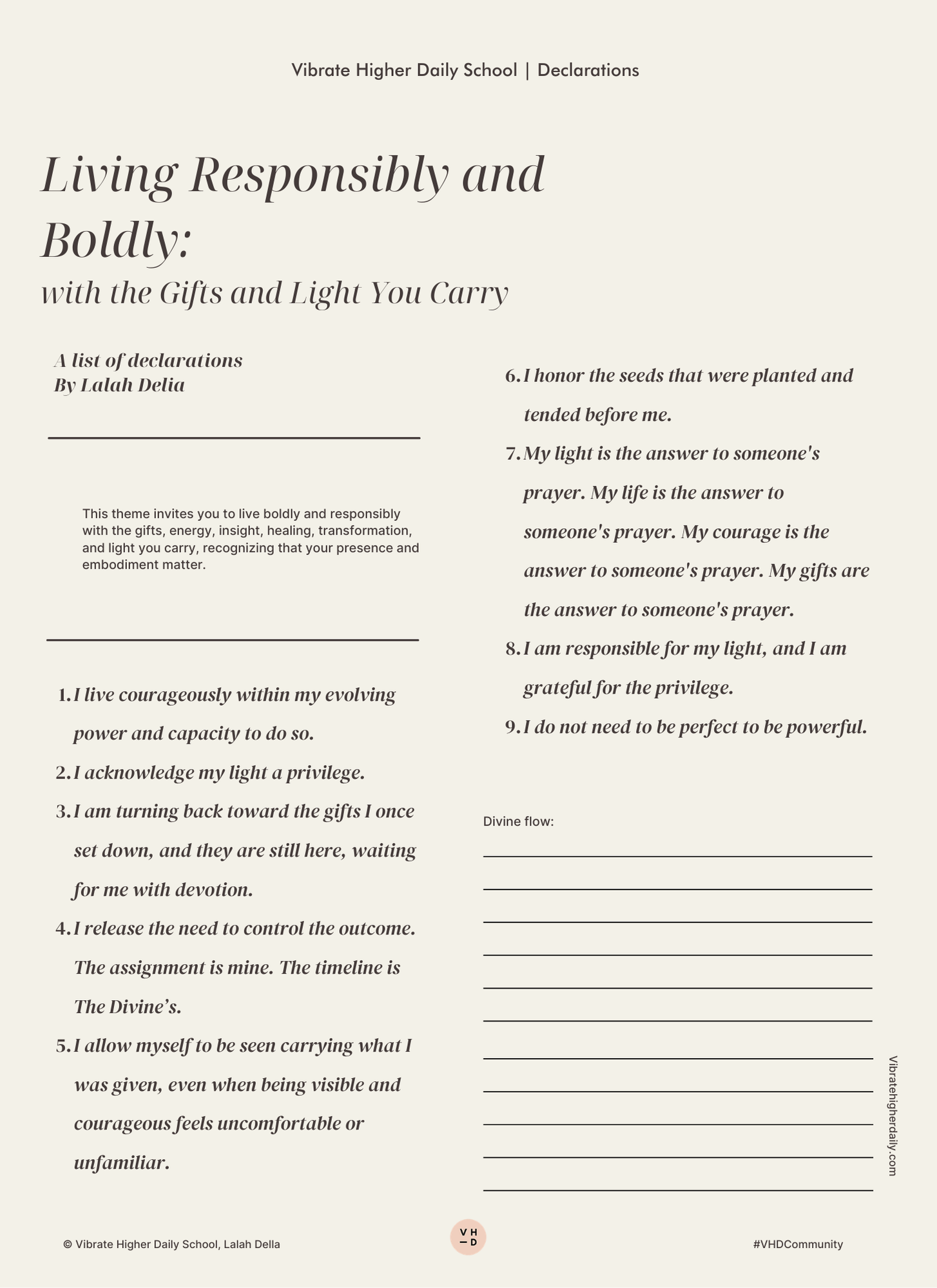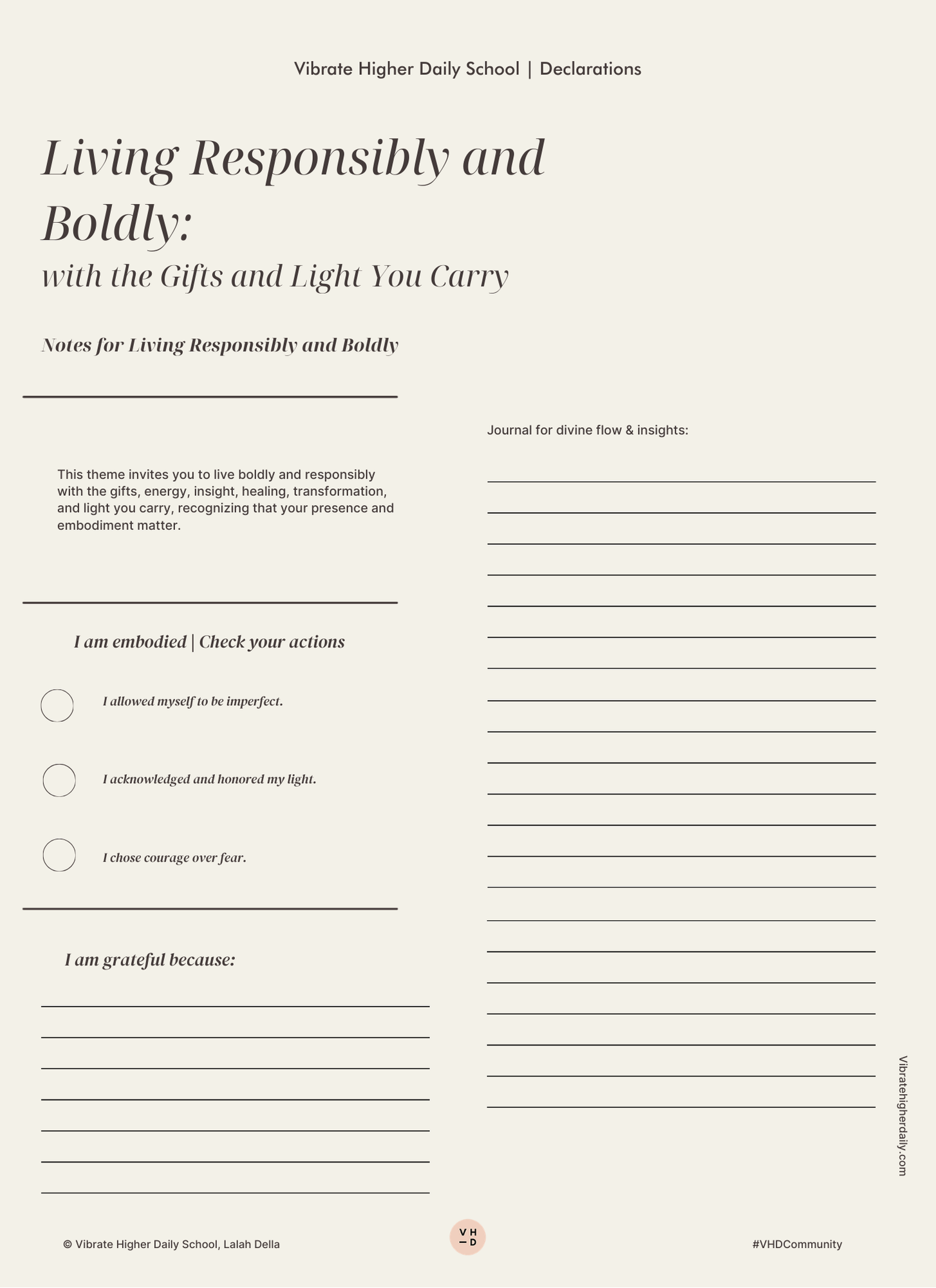 Now you can work even deeper with Living Responsibly and Boldly with the Gifts and Light You Carry, with our all-new downloadable and printable PDFs. You can download the journal only or the set, which includes declarations and the journal.