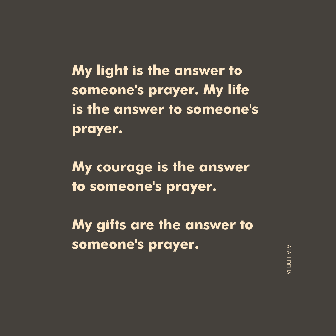 My light is the answer to someone's prayer. My life is the answer to someone's prayer. My courage is the answer to someone's prayer. My gifts are the answer to someone's prayer.