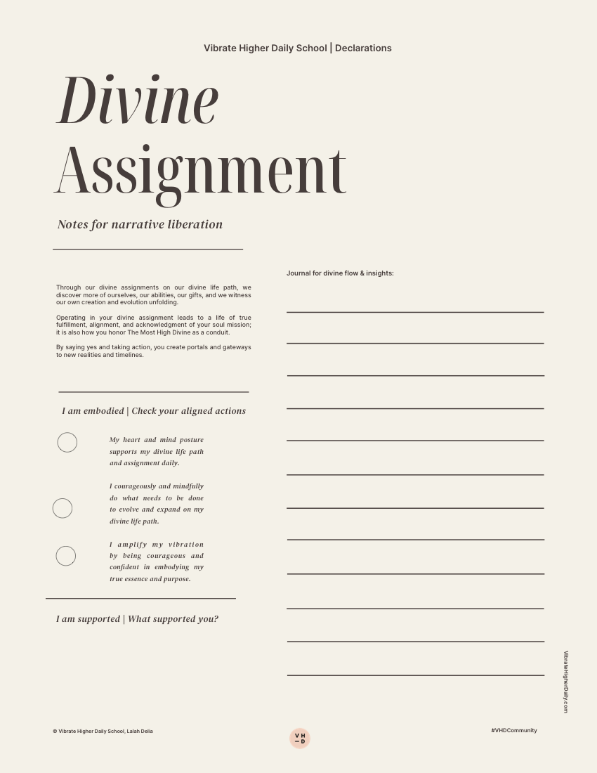 Remember, living in alignment with our divine assignments does not mean a life free from challenges. It means embracing the challenges as opportunities to grow and evolve on our paths. Our divine life path and assignment will stretch us. If you notice that you’re not growing and evolving, it may be a sign that you are not fully aligned with your divine life path and assignment. Aligning may require a shift in your environment, connections, spiritual life, mindset, and well-being lifestyle. As I’ve shared in VHD classes before, our healing is environment-specific, as is our divine assignment.