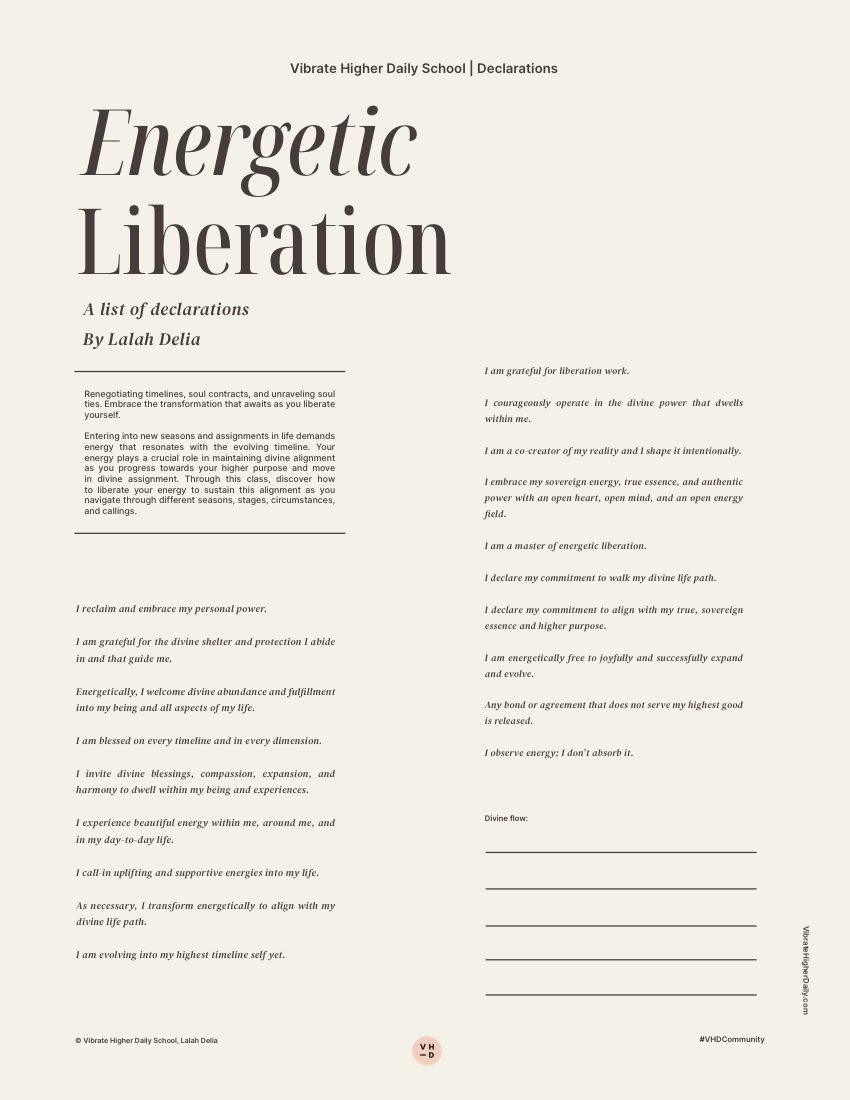Through a series of carefully crafted declarations, we’ll declare and affirm transformation and renewed energy as we embrace the transformation and expansion that come with liberating ourselves and stepping into our divine essence. Our themed declarations will serve as guiding principles to navigate your journey to Energetic Liberation.